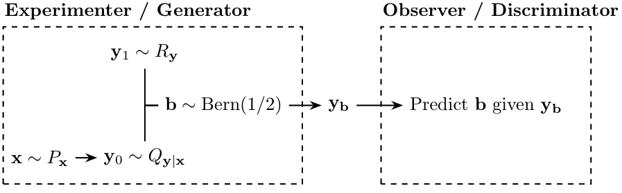 - Distinguishability \(\Leftrightarrow\) classification risk (such as error probability) between \(Q_y\) and \(R_y\)